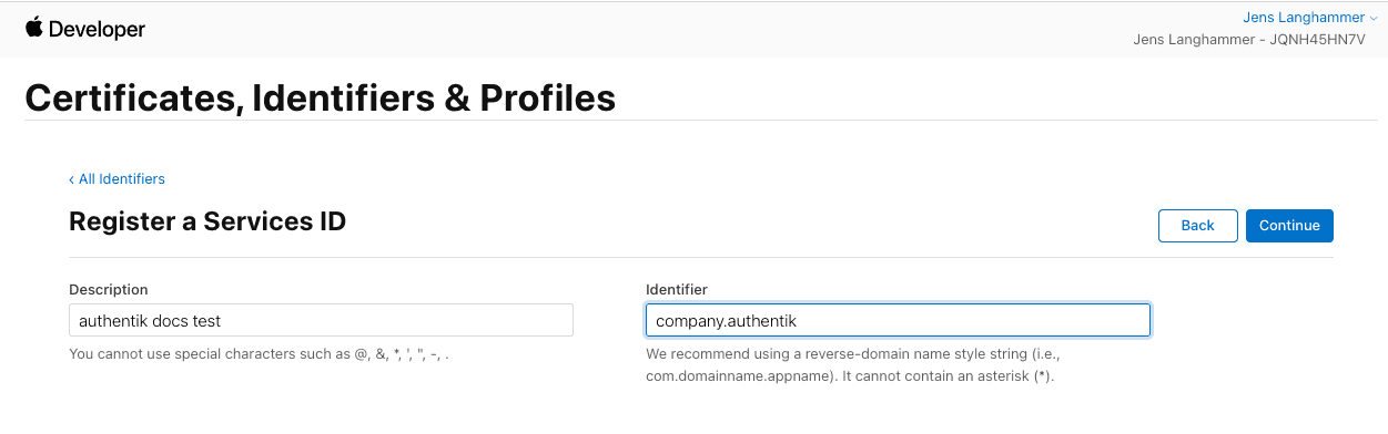 To integrate Apple with authentik, you will need to register two identifiers and a key in the Apple Developer Portal.
